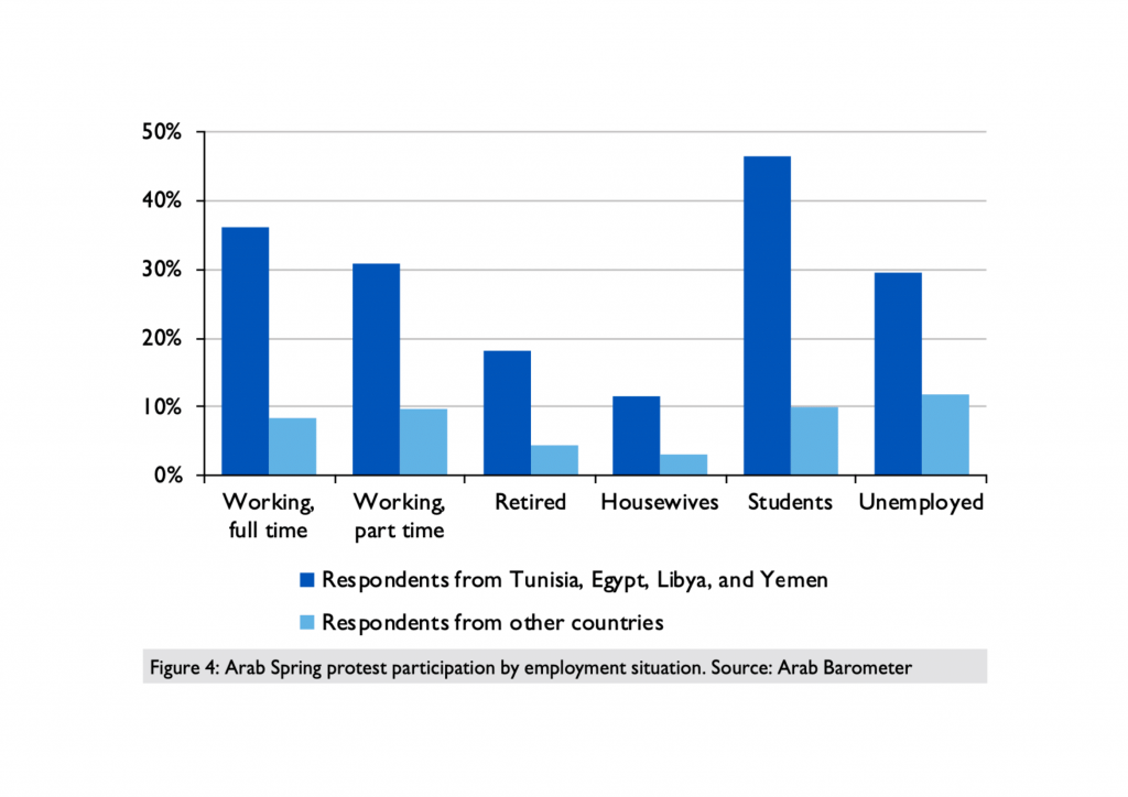 Ma chi manifestava? Se guardiamo alle caratteristiche demografiche di queste proteste, si nota una tendenza molto chiara: giovani tra i venti e i trent’anni in media. Questo è giustificato dal fatto che in questi paesi vi era (e in alcuni paesi ancora è) una forte presenza di youth bulge, ovvero un rigonfiamento della fascia giovanile nella piramide dell’età. Secondo l’Arab Barometer, il 40% dei giovani tra i diciotto e i vent’anni, e più del 30% dei giovani tra i diciotto e i trent’anni hanno preso parte alle manifestazioni. Tenendo conto che questi paesi avevano (e hanno ancora) una popolazione molto giovane – con più del 30% formata da persone tra i quindici e i ventiquattro anni – presero parte alle manifestazioni veramente tante persone. L’importanza dell’età è, quindi, di vitale importanza per capire il fenomeno della Primavera Araba.