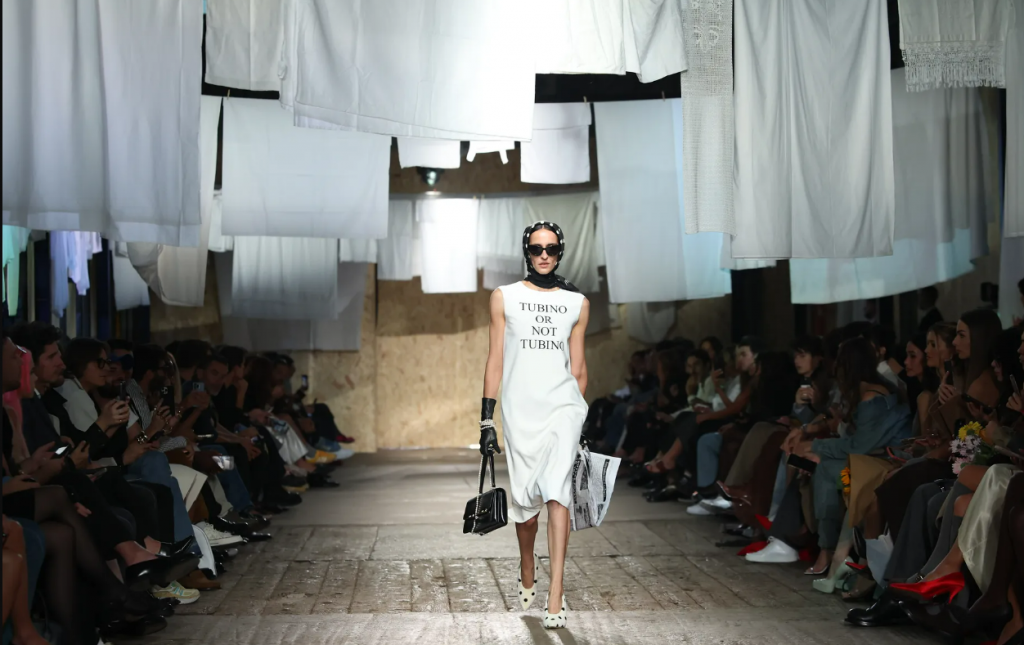 Mai pienamente accettato dal sistema – nonostante il suo successo –, fu spesso emarginato dai colleghi e dalla stampa che gli riservava poche righe e poche foto quasi a voler nascondere la sua critica, giudicata troppo violenta e invasiva. Un pensiero naturale questo, nel momento in cui Moschino la sua critica la scriveva chiaramente nero su bianco sulle t-shirt in crepe di seta, con messaggi chiarissimi come “Good taste doesn’t exist”, “Stop the fashion system” o il geniale “Tubino or not Tubino”, che prendeva in giro i codici di abbigliamento formali del mondo della finanza e dell’industria milanese di quegli anni. Da questa critica non risparmiava neanche sé stesso, giocando col suo cognome nelle tshirt “Mo-schifo”, o usando sé stesso come unico modello delle campagne pubblicitarie. Moschino non ha mai visto la moda solo come abbigliamento, piuttosto come un’esperienza performativa nella quale il corpo umano diventava una tela su cui dipingere concetti complessi e provocatori. Le sue sfilate erano veri e propri spettacoli teatrali, dove il confine tra arte e moda era volutamente sfumato. Lo stilista invitava il pubblico a ridere di se stesso, a riflettere su cosa significasse davvero esprimersi attraverso l’abbigliamento e a decostruire l’immagine di perfezione associata all’industria.