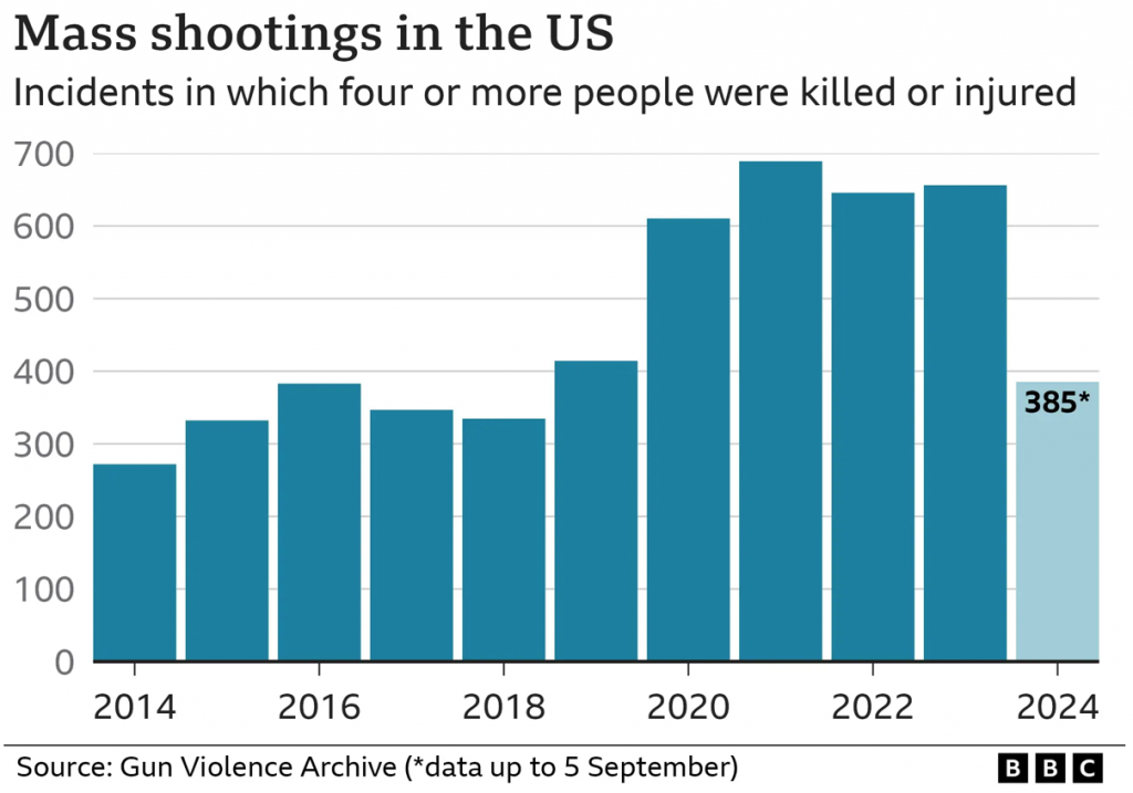 - BBC, How many US mass shootings have there been in 2024?, in “BBC”, 2024.https://bbc.com/news/world-us-canada-41488081. Consultato il 17 novembre 2024.