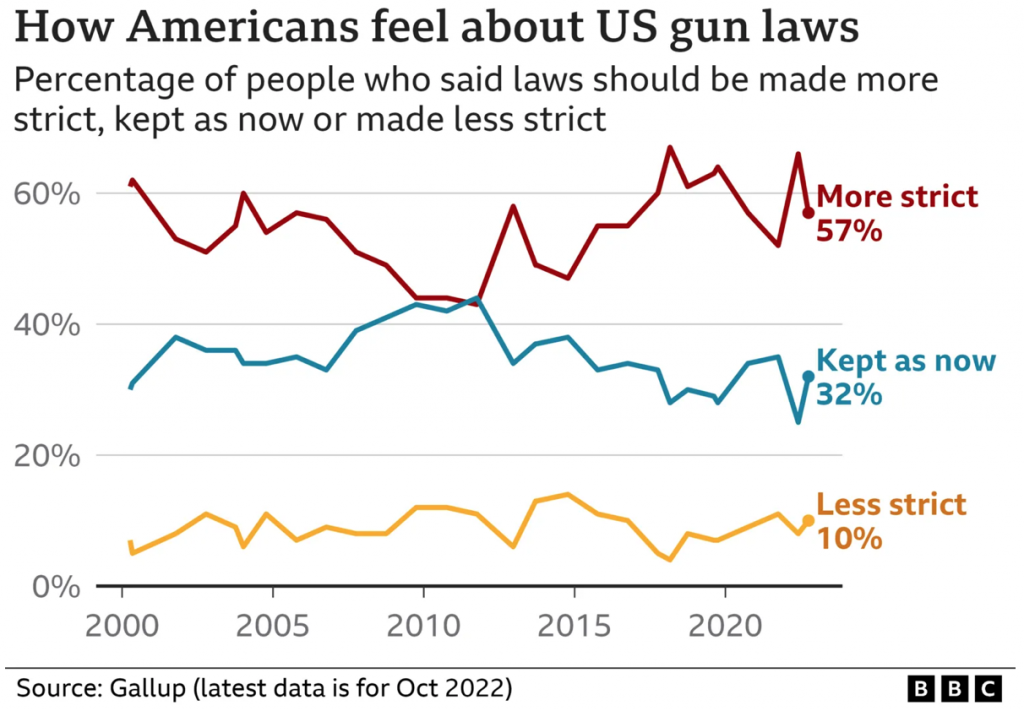 Le pressioni della NRA sui candidati e sui legislatori potrebbero far pensare che anche i cittadini americani condividano le posizioni della lobby delle armi. Tuttavia, secondo un sondaggio della Gallup del 2022, il 57% degli americani credono che la legislazione debba essere resa più stringente, mentre solamente il 10% pensa che debba essere meno restrittiva. Un altro sondaggio della Gallup ha rivelato che circa il 91% degli elettori democratici sostengono l’introduzione di leggi più severe, mentre solo il 24% degli elettori repubblicani la pensa allo stesso modo. Secondo un’indagine del Pew Research Center (2023), solamente il 32% della popolazione americana possiede un’arma da fuoco, mentre circa il 40% sostiene di vivere in un’abitazione in cui è presente un’arma. Se si guardano i dati divisi nelle diverse categorie, si può comprendere quali sono le fasce della popolazione che possiedono armi: sono principalmente uomini, bianchi, Repubblicani e abitanti delle aree rurali del Paese.