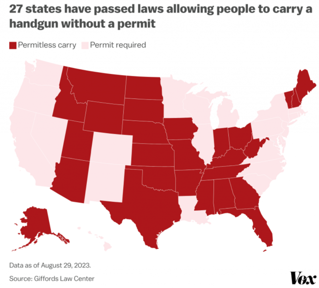 Dal 2015, venticinque Stati hanno emanato leggi che consentono agli americani di trasportare armi nascoste senza un permesso e, due anni fa, sei giudici della Corte Suprema – di cui tre nominati da Trump durante il suo primo mandato – hanno ribaltato una legge dello Stato di New York che imponeva limiti più rigidi sul trasporto di un’arma in pubblico. Tre anni fa, il governatore del Texas Greg Abbott firmò una legge che «consente ai residenti dello Stato di portare armi da fuoco senza una licenza o previo addestramento». Analogamente, lo scorso anno, nello Stato della Georgia è stato eliminato l’obbligo di licenza o permesso per il trasporto di armi da fuoco, emendamento che è stato supportato anche dalla NRA.